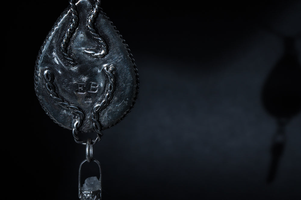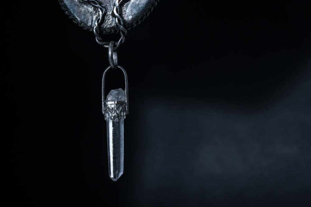 Dripping down from your neck lays the frozen wasteland of winter, encased in dendritic opal- layers of snow, barren tree branches and icy rivers appear in its composition while a crowned icicle of quartz hangs below, unmelting.