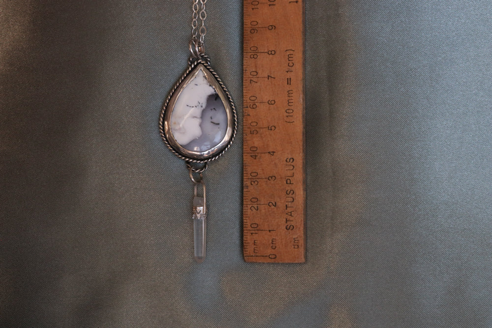 A one of a kind piece from my first all-silver collection: Dendritic opal set in sterling, enrobed in a rope of silver and finished off with a small quartz point drop. An oval cable chain and lobster clasp finishes the pendant off, adjustable up to 30 inches.